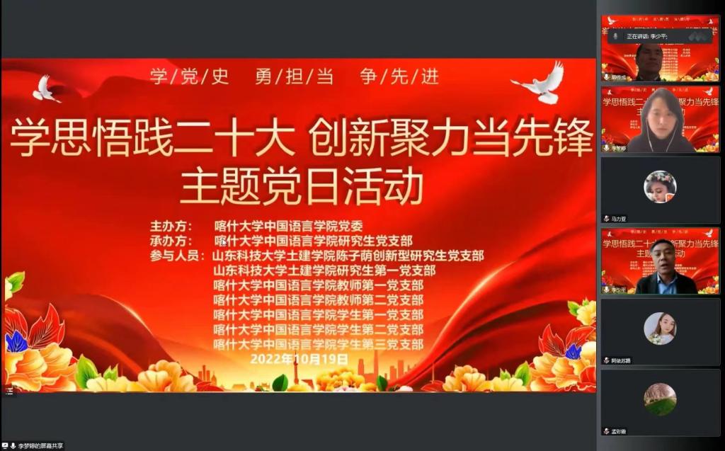 为庆祝党的二十大胜利召开,激发广大师生党员学习党的二十大精神,10月19日,澳门太阳游戏城官方网站研究生党支部与喀什大学中国语言学院党支部线上开展“学思悟践党的二十大 创新聚力当先锋”主题党日活动。喀什大学中国语言学院党委书记李少平、喀什大学中国语言学院教师党支部、学生党支部,学院陈子荫创新型研究生党支部、研究生第一党支部参加了此次会议。会议由喀什大学中国语言学院研究生党支部组织委员李梦婷主持。